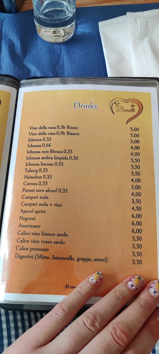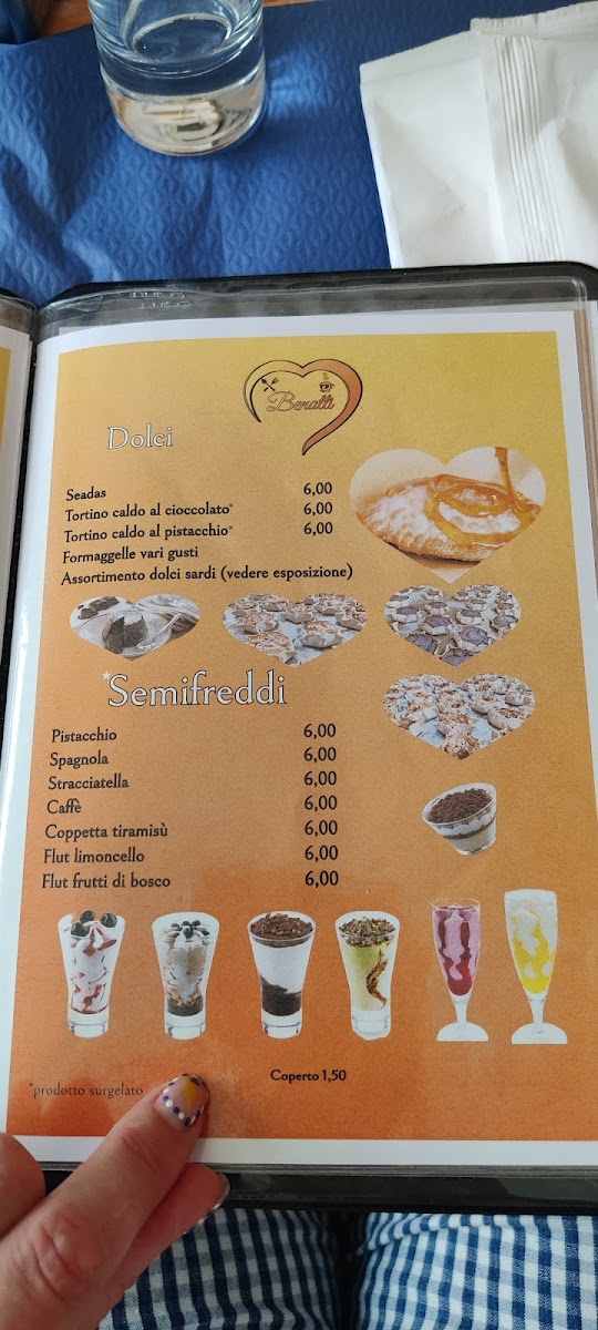 Food items include a variety of pizzas, some highlighting regional flavors such as Pizza Sarda with sausage and pecorino cheese. Additionally, the menu offers local specialties like Seadas (a Sardinian dessert), Pane Di Garibaldi, and Formaggelle, alongside typical Italian dishes such as Tagliatelle Bolognese. Light bites and savory options like Cheese Onion and Focaccia Salame e Mozzarella complement the main offerings.